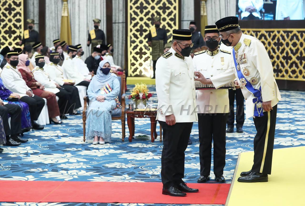 YANG di-Pertua Melaka, Tun Seri Setia (Dr.) Mohd Ali Mohd Rustam menganugerahkan Darjah Pangkuan Seri Melaka (D.P.S.M.) yang membawa gelaran Datuk kepada Ahli Lembaga Pengarah MHI, Datuk Kamarudin Ahmad pada sesi kedua Istiadat Penganugerahan Darjah, Bintang dan Pingat Kebesaran Negeri Melaka sempena Sambutan Hari Jadi ke-72 Tuan Yang Terutama (TYT) Yang di-Pertua Negeri Melaka Tahun 2021 di Balai Istiadat Seri Negeri, Ayer Keroh. Foto: MR. Azli