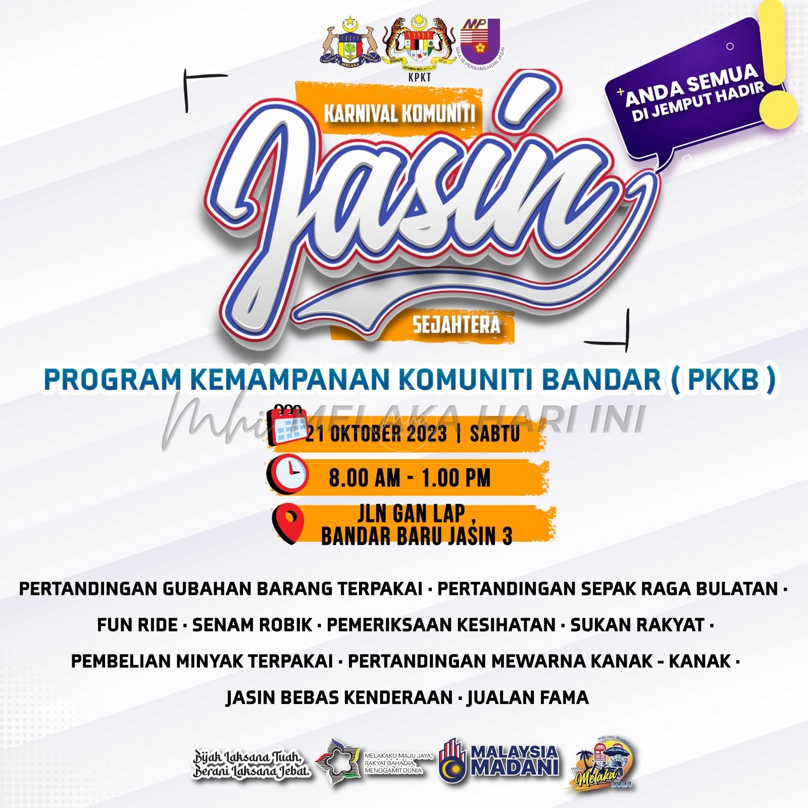 JASIN 19 Oktober – Orang ramai dijemput hadir bagi memeriahkan penganjuran Karnival Komuniti Jasin Sejahtera bersempena Program Kemampanan Komuniti Bandar (PKKB) di Bandar Baru Jasin Seksyen 3, Sabtu ini.