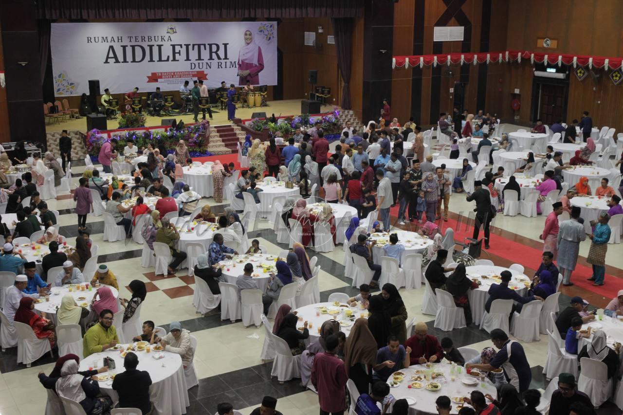 RIM 25 April – Lebih 5,000 pengunjung terdiri daripada pelbagai golongan masyarakat hadir ke Rumah Terbuka Aidilfitri Dewan Undangan Negeri (DUN) Rim di Dewan Alamanda, Jasin, malam tadi.