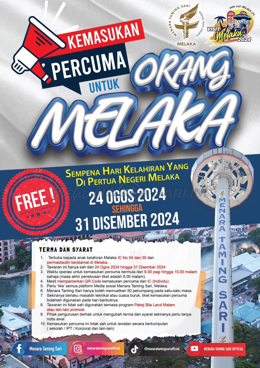 “Sebagai makluman setiap lokasi pelancongan menetapkan syarat kemasukan mengikut kesesuaian masing-masing. Contoh Menara Taming Sari turut mensyaratkan rakyat Melaka mahu menebus tiket supaya melanggan (like) semua platform media sosial Menara Taming Sari Melaka.