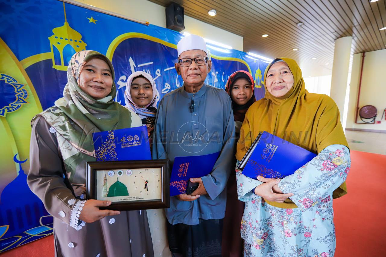 Terdahulu Yacob bersama keluarganya menerima anugerah khatam al-Quran bagi surah Al-Baqarah pada Majlis Haflah Qurra’ Kali Ke-9 Program Hafazan Dewasa Masjid-Masjid Negeri Melaka (PHDMMNM) di Auditorium Masjid Al-Azim, Sabtu lalu.