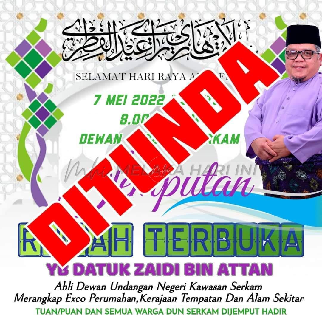 SERKAM 5 Mei – Rumah terbuka Ahli Dewan Undangan Negeri (ADUN) Serkam Datuk Zaidi Attan dijadualkan pada Sabtu, 7 Mei ditunda ke satu tarikh lain yang akan dimaklumkan kemudian.